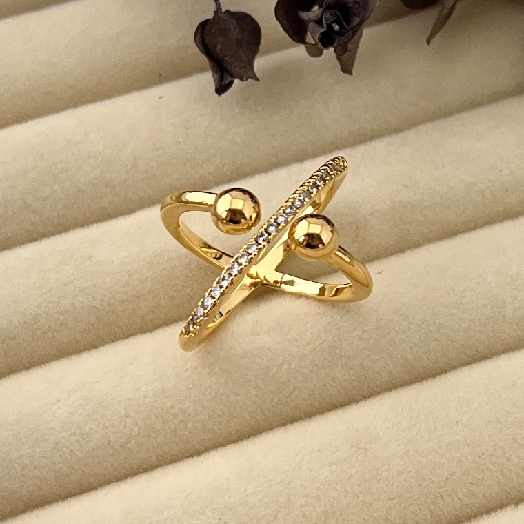 O Anel aro 13 cravejado e bolas lisas é a união perfeita entre brilho e delicadeza. Seu design combina detalhes cravejados com esferas lisas, criando um contraste elegante que valoriza ainda mais a peça.