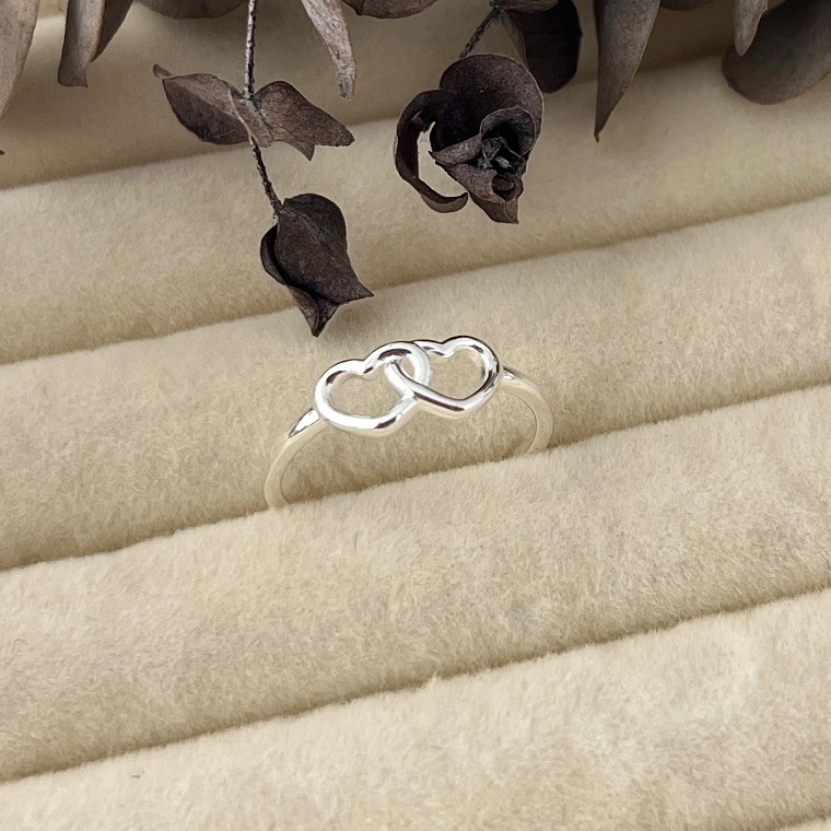 O Anel aro 19 dois corações entrelaçados vazados é uma peça delicada e cheia de significado. O design traz dois corações unidos de forma harmoniosa, simbolizando amor, conexão e cumplicidade.