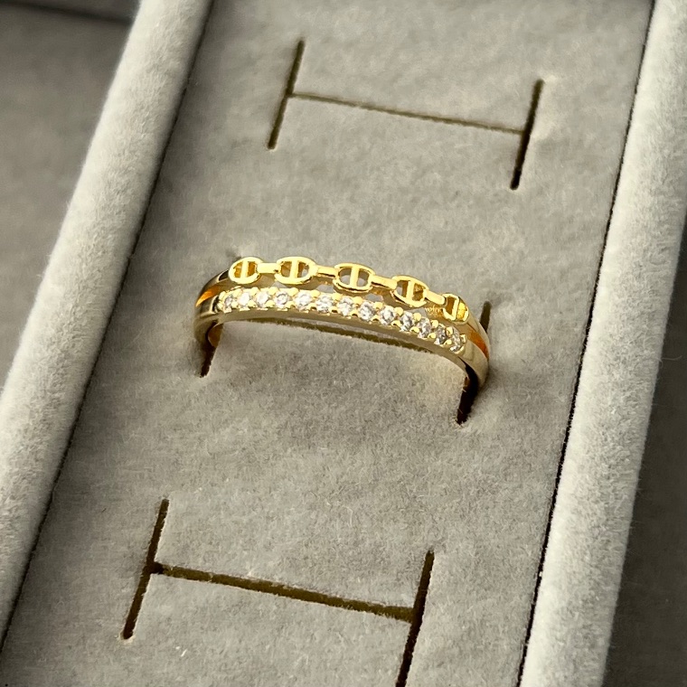 Este anel combina duas fileiras cravejadas com detalhes de elos em corrente, criando um design elegante e contemporâneo. Perfeito para usar sozinho ou em sobreposição com outros anéis, ele adiciona personalidade e brilho ao look. Produzido com materiais de qualidade, garante conforto, durabilidade e acabamento impecável.