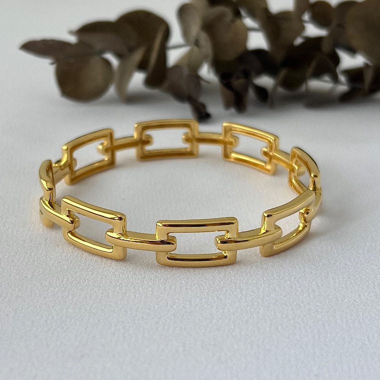 Design arrojado e cheio de movimento: o bracelete de retângulos vazados combina geometria e leveza, criando uma peça moderna e marcante.