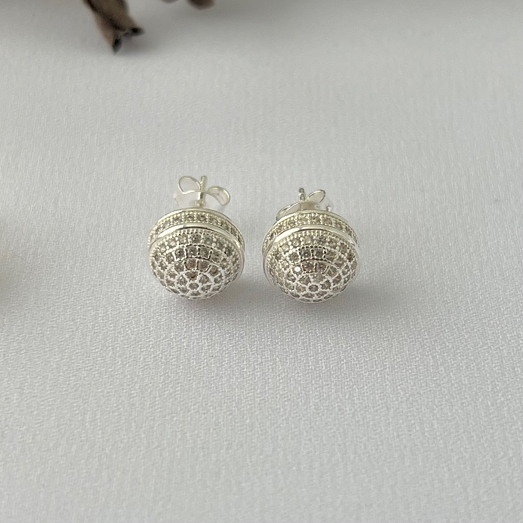 Brinco botão cravejado em banho de prata silver