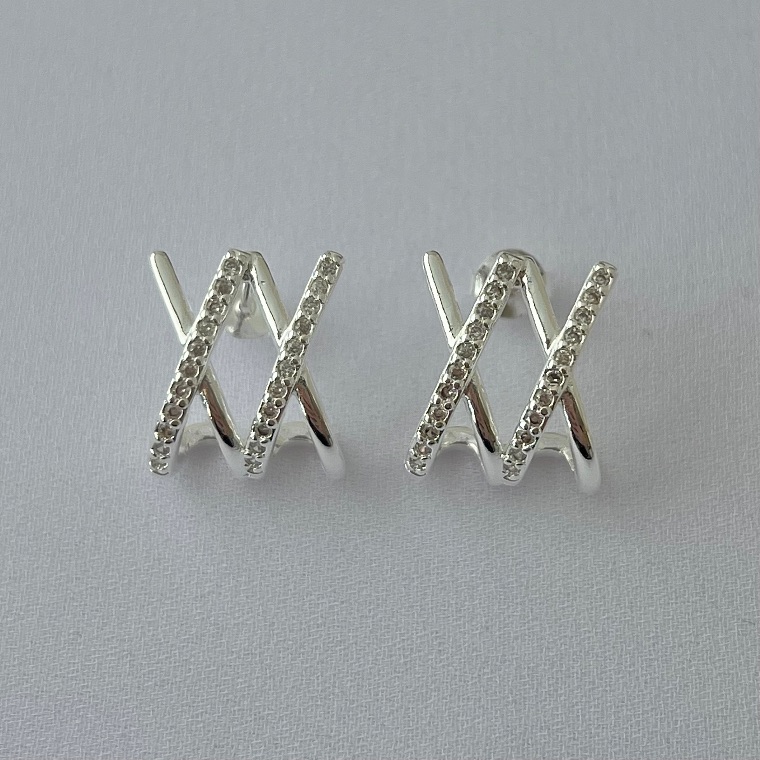 Brinco formato X liso e cravejado em banho de prata silver