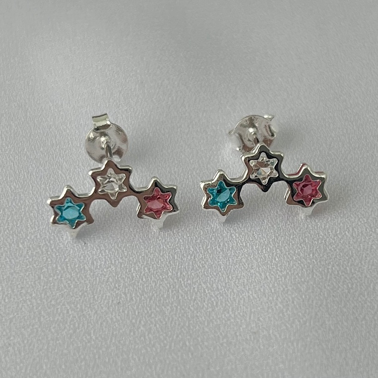 Brinco infantil três estrelas coloridas em banho de prata silver
