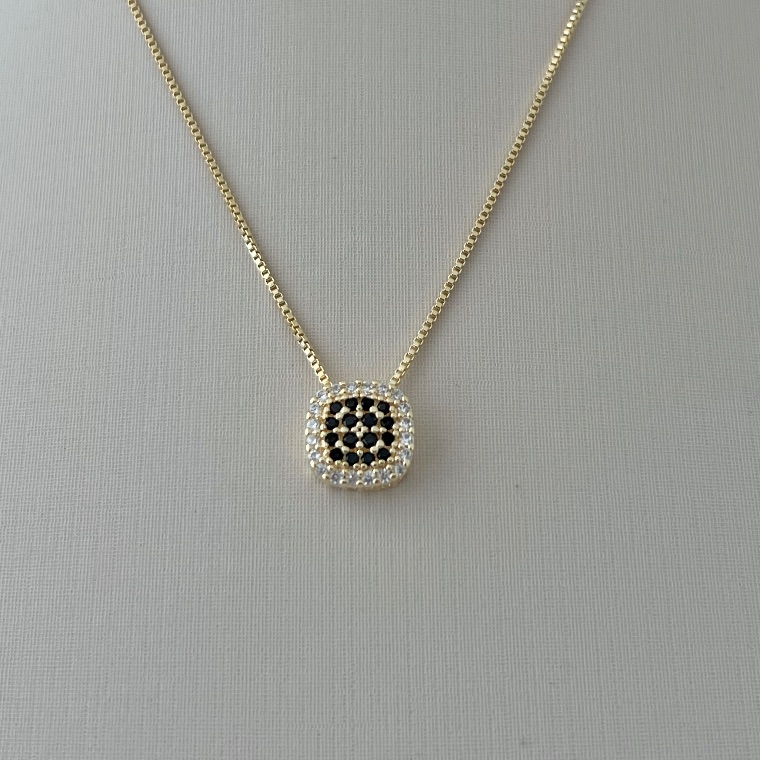 O colar com pingente quadrado cravejado preto é uma semijoia elegante e contemporânea, perfeita para quem busca design moderno com um toque de sofisticação. Seu pingente quadrado, delicadamente cravejado com zircônias pretas, cria um contraste refinado e valoriza o colo com estilo e personalidade.