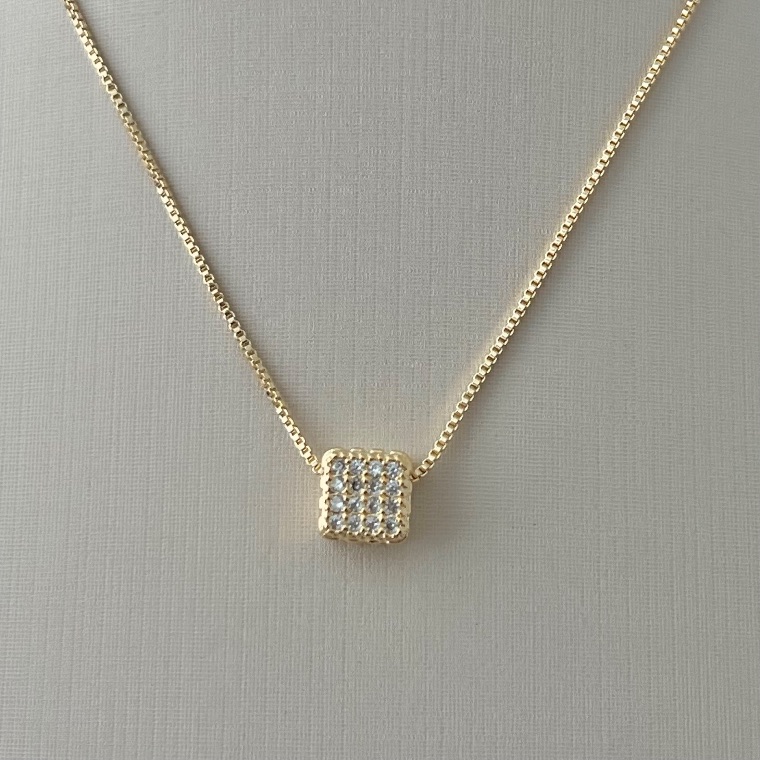 Colar pingente quadrado cravejado em banho de ouro 18k