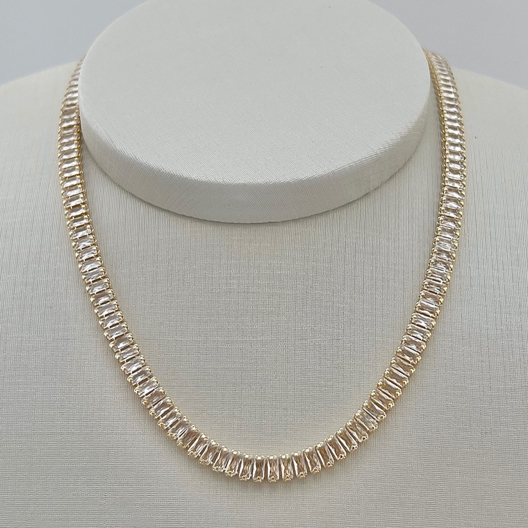Elegante e marcante, o Colar Riviera Baguete é a definição de sofisticação atemporal. Com pedras em corte baguete alinhadas perfeitamente, a peça entrega brilho intenso e acabamento refinado, criando um visual luxuoso que valoriza o colo com imponência e delicadeza na medida certa. Ideal para ocasiões especiais, eventos noturnos ou para elevar produções mais elegantes, é um colar que se destaca sozinho, dispensando combinações. Uma semijoia clássica, poderosa e indispensável para quem busca impacto e elegância.