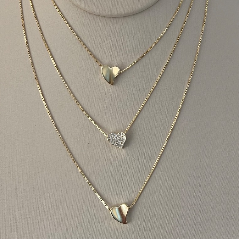 O colar triplo com pingentes de corações lisos e cravejados é a combinação perfeita de delicadeza e brilho. Seus três pingentes em formato de coração, alternando acabamentos lisos e cravejados com zircônias, criam um efeito moderno, feminino e cheio de estilo, valorizando o colo com elegância.