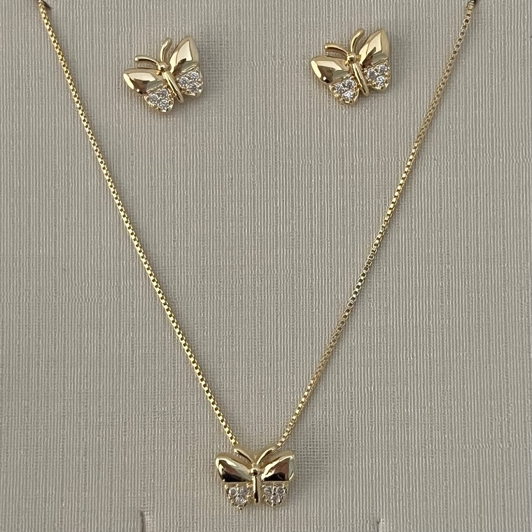 Conjunto infantil de borboleta cravejada em banho de ouro 18k