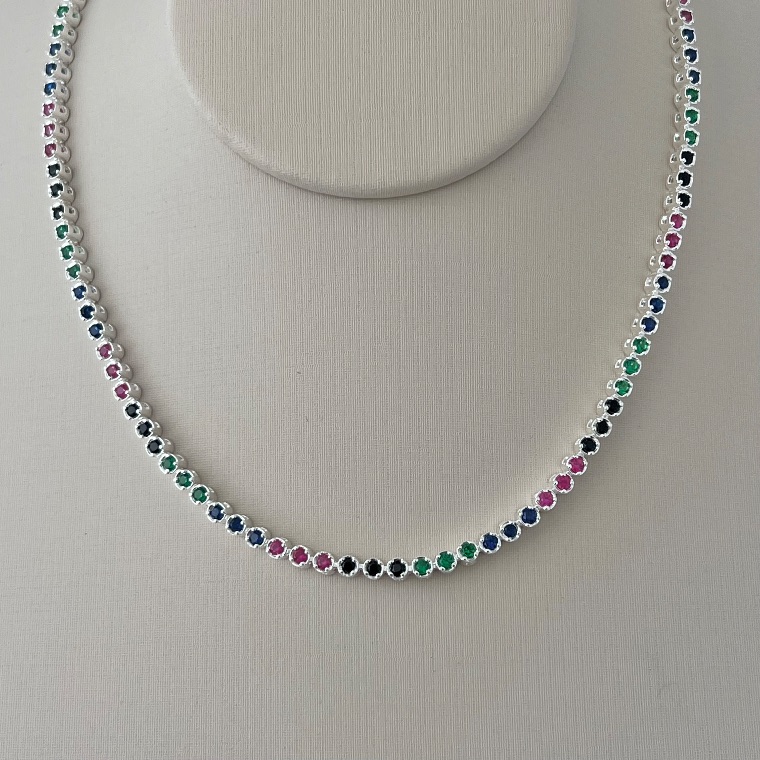 Elegante e vibrante, a corrente Riviera colorida é composta por pedras cravejadas em tons variados que criam um brilho intenso e um visual sofisticado.