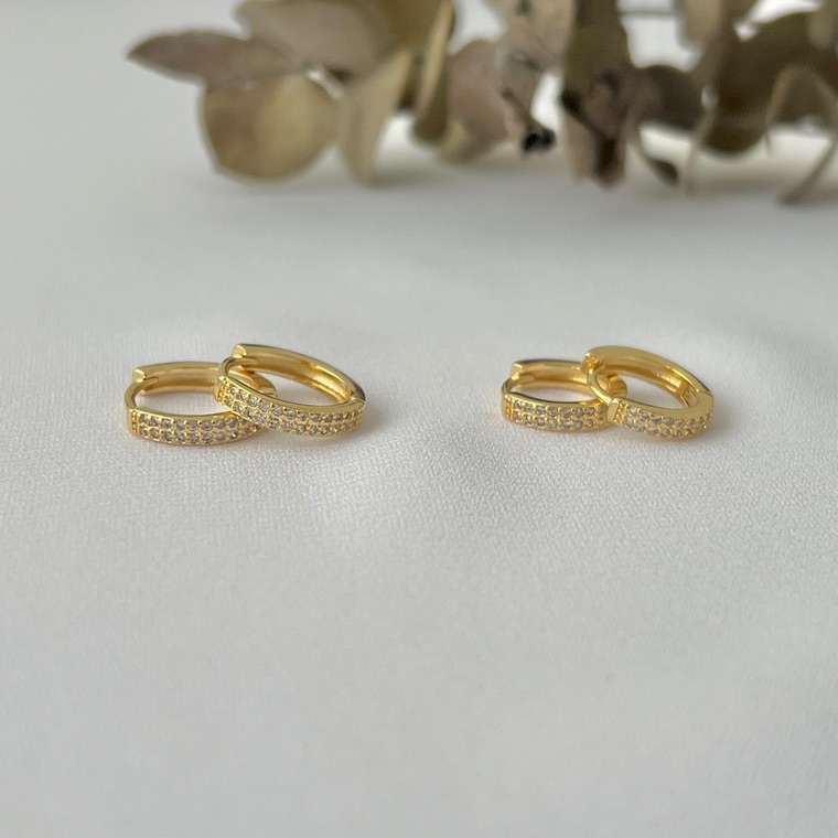Dupla de argolas duas colunas cravejadas em banho de ouro 18k