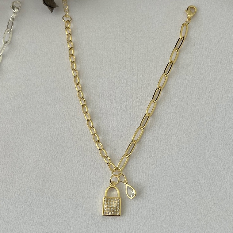Pulseira com cadeado cravejado e ponto de luz em gota em banho de ouro 18k