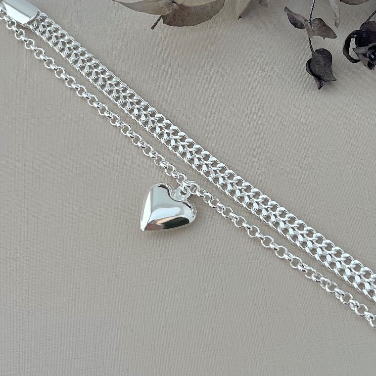 Pulseira dupla com pingente de coração abaloado em banho de prata silver