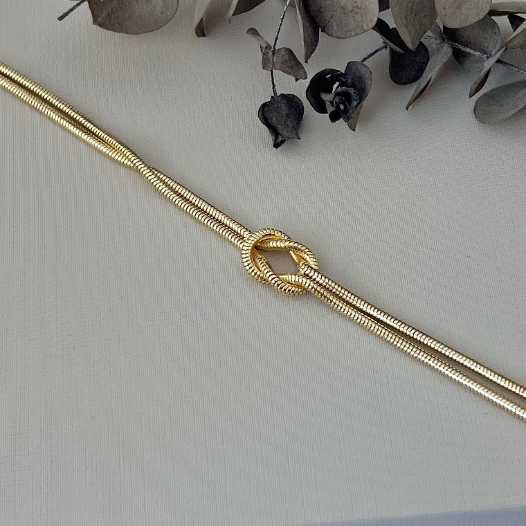 A Pulseira Nó Salamandra Fina é delicada, elegante e cheia de significado. Com estrutura maleável no estilo salamandra, ela se ajusta perfeitamente ao pulso, garantindo conforto e caimento impecável.