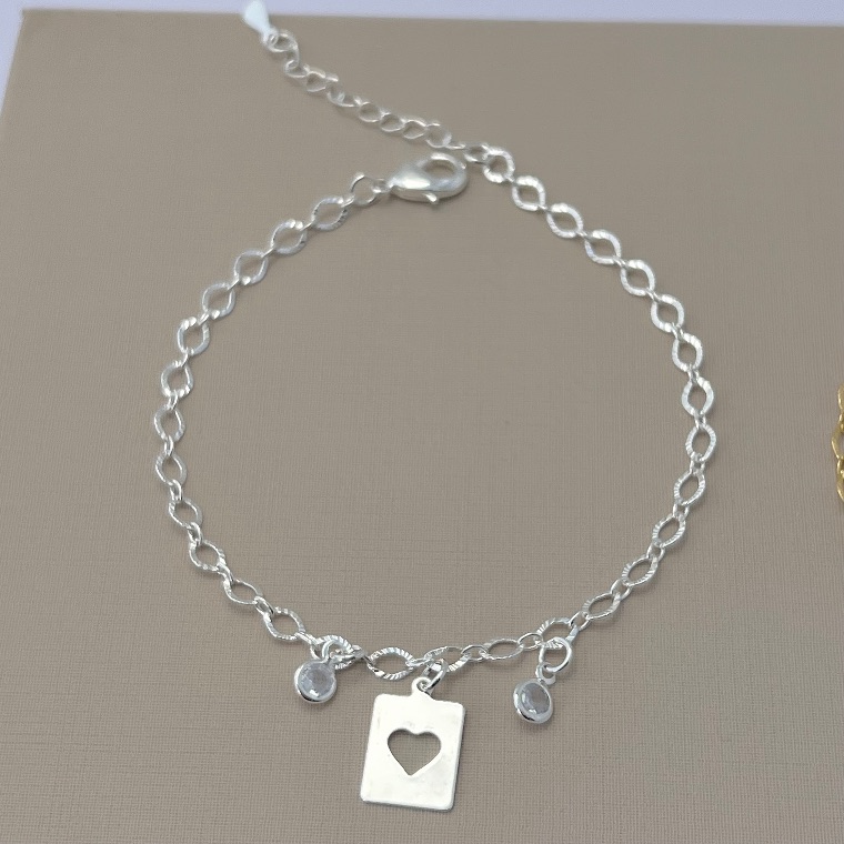 Pulseira placa com coração vazado e pontos de luz em banho de prata silver