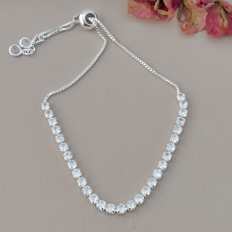 A Pulseira Riviera com Fecho Gravata é sinônimo de brilho e sofisticação. Com pedras alinhadas que criam um efeito luminoso contínuo, ela valoriza o pulso com elegância e delicadeza, sendo perfeita para quem ama peças refinadas.