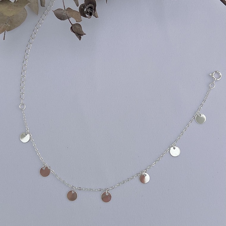 Moedas que dançam suavemente na tornozeleira, trazendo movimento e leveza ao visual. Um detalhe simples, mas cheio de personalidade, perfeito para quem gosta de acessórios descontraídos.