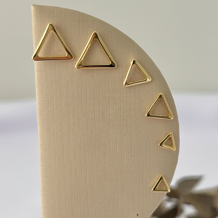 Trio de brincos formato triângulos vazados é um conjunto moderno e versátil, perfeito para quem gosta de acessórios geométricos e cheios de estilo. Com design em triângulos vazados e três tamanhos diferentes, permite combinações criativas para múltiplos furos ou para variar o visual. Leves e sofisticados, esses brincos são ideais para o dia a dia ou para ocasiões especiais, sendo semijoias atemporais que unem elegância, modernidade e charme em cada detalhe.